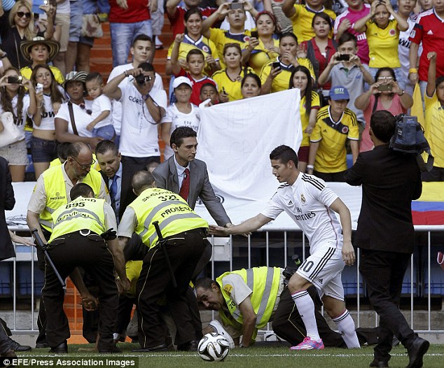 Who says footballers are cocky and don’t care about their fans? Check out the video below to see how James Rodriguez saved a fan wearing a Colombia shirt from the hands of security guards. The fan had run onto the pitch after evading security personnel while World Cup hero Rodriguez was freestyling at his grand unveiling at the Bernabeu after he completed his move to Real Madrid.