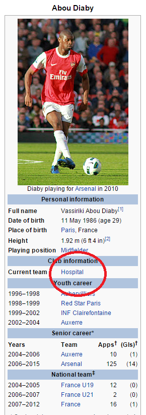 This is indeed a wonderful opportunity for Diaby who is being given a chance to continue playing in the top flight after making just 124 appearances for Arsenal in 10 years. His infamous injury record though has not been forgotten as a few pranksters took up a new method to troll him. Diaby’s Wikipedia page was altered to poke fun at his horrendous injury record and although it’s been set straight again, we can only hope that the same can be said about the player’s fortunes.